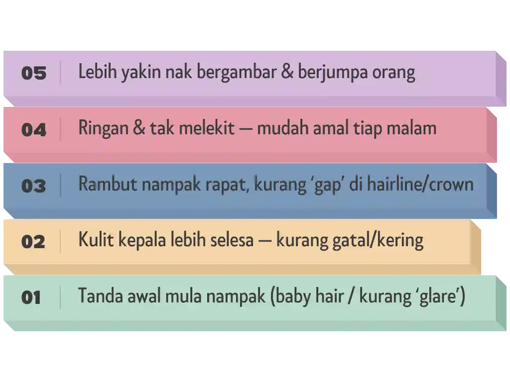 Ramai perasan kurang gugur 1–2 minggu; baby hair biasanya muncul 3–6 minggu bila konsisten. Kepadatan menyeluruh ambil masa & disiplin.
