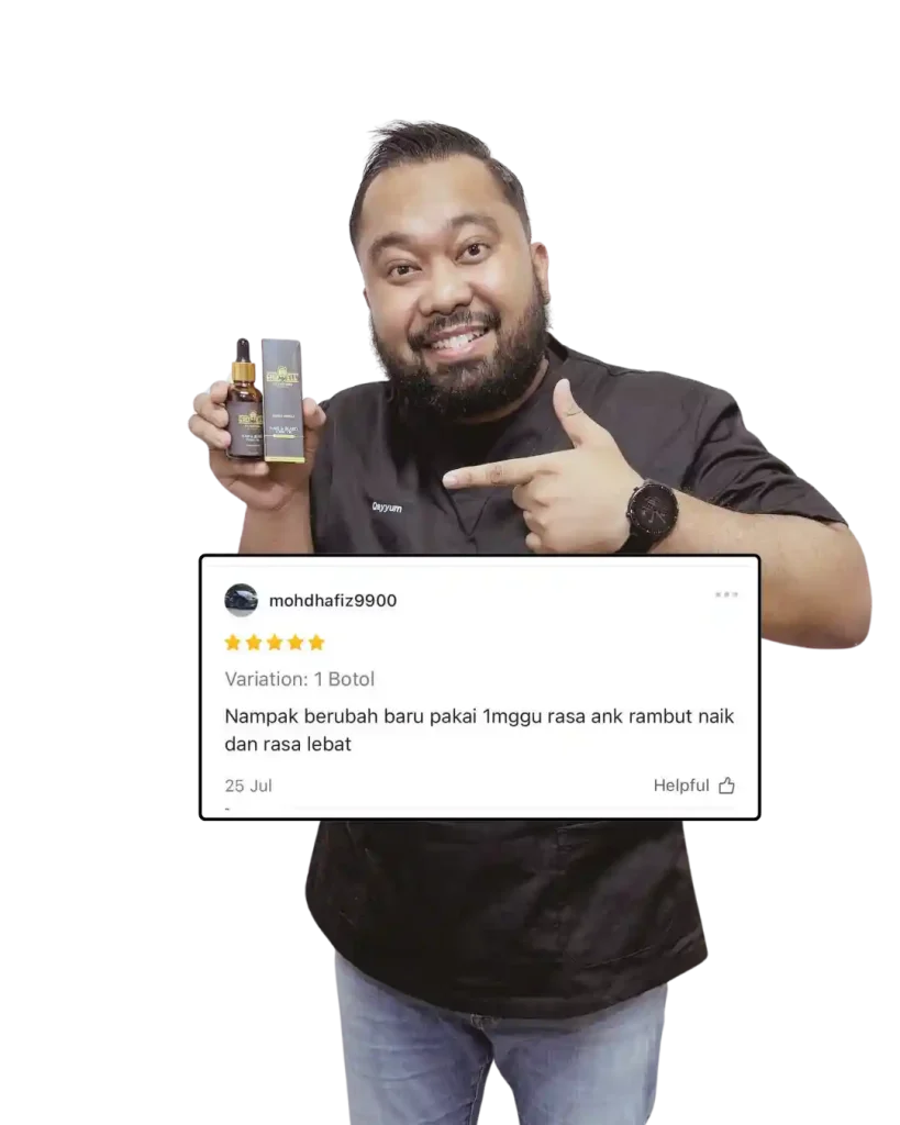 3–5 titis pada kawasan nipis selepas mandi/ sebelum tidur, urut 1–2 minit, tak perlu bilas. Ulang setiap malam. (Janggut/kening: 1–2 titis).