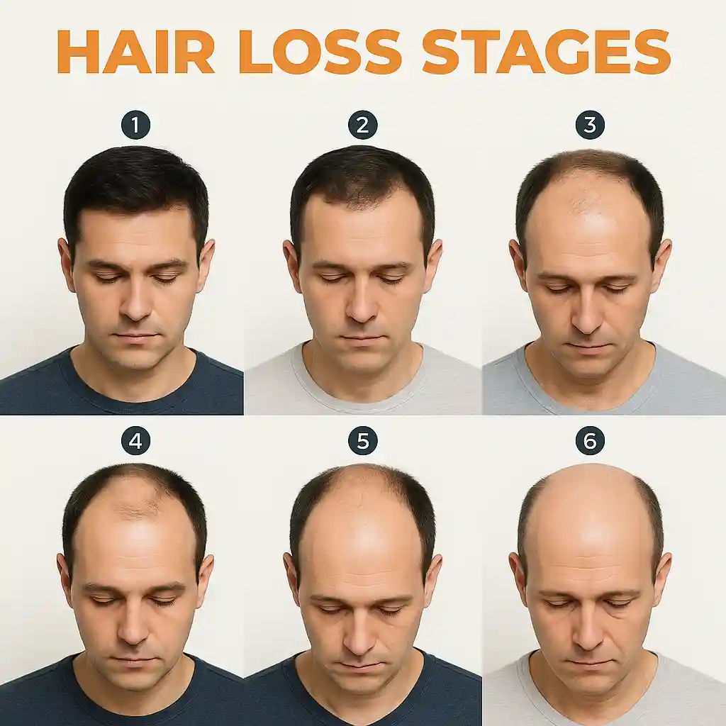Lelaki & wanita yang mengalami M-shape, crown O-shape, belahan tengah jarang, menipis menyeluruh, serta janggut/misai jarang dan kening menipis.